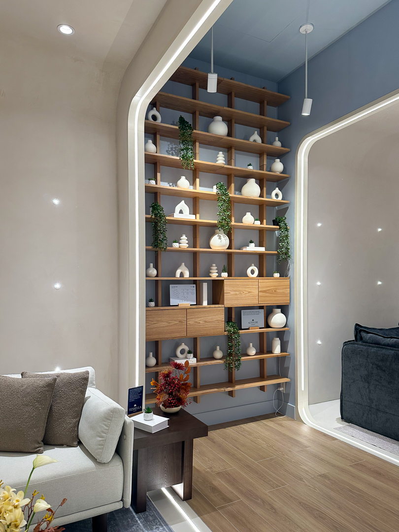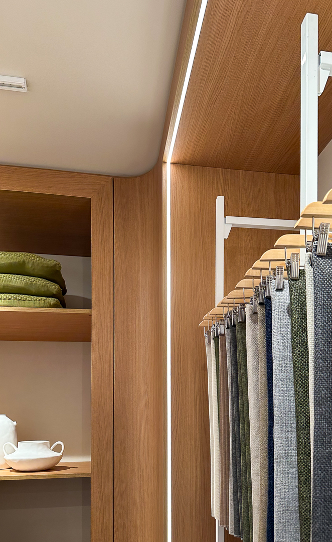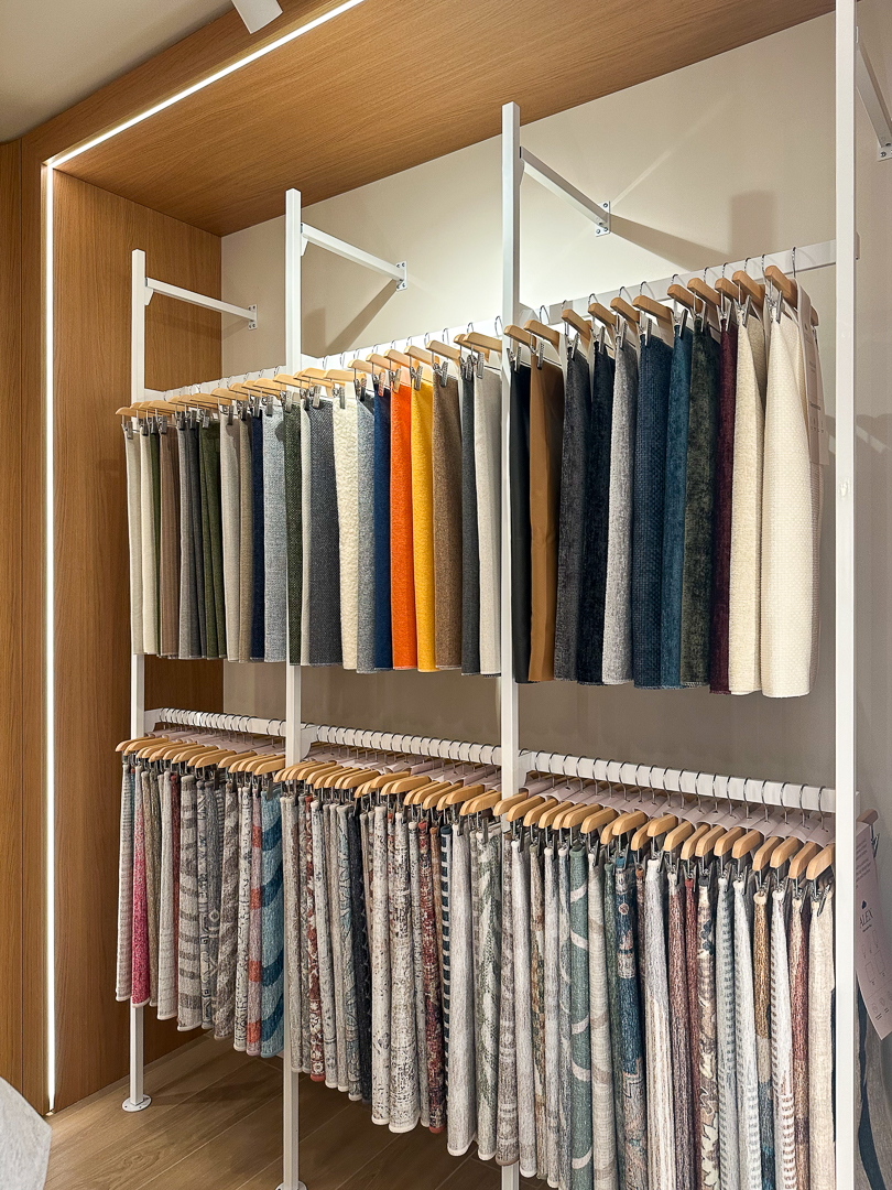 Upon arrival at the back of the space, guests are met with fabric swatches and scale models where they can plan their living area, and make decisions on furniture type, layout, and colour.