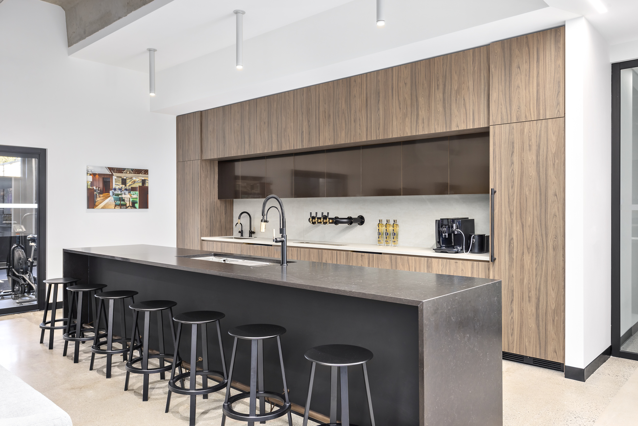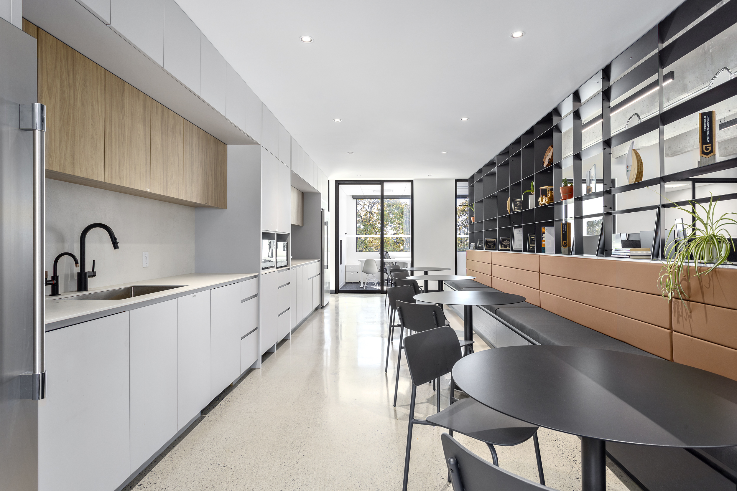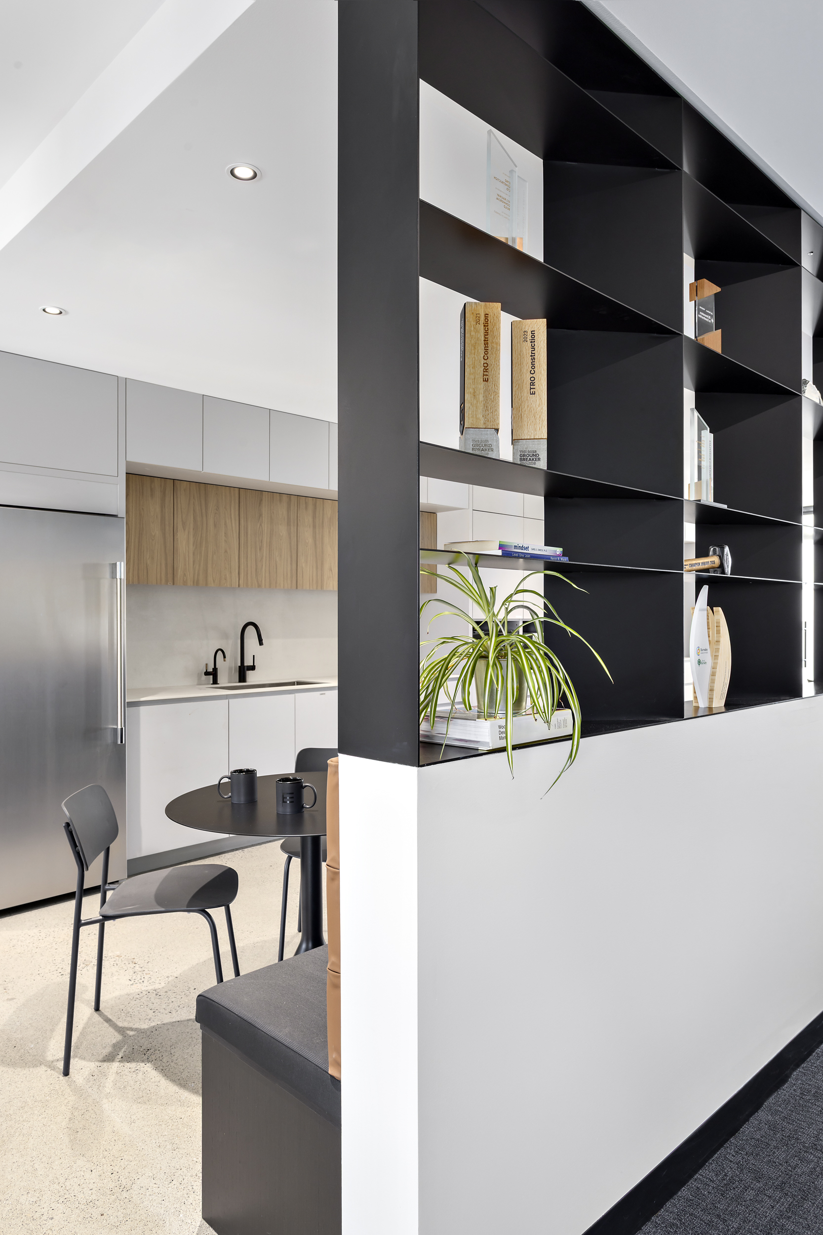 The alignment of vision and execution resulted in a highly successful transformation of the ETRO Construction headquarters, where MGBA reimagined an unpolished, underutilized space to reveal and celebrate the building’s inherent architectural character. Working closely with the highly collaborative and communicative ETRO team, the design emphasizes connection, quality, and authenticity—most notably through the introduction of a central staircase that links the two floors, creating a strong sense of arrival and visual continuity throughout the workplace. The main level is organized around collaboration and community, featuring a spacious kitchen and café-style gathering area, along with a dedicated wellness zone that supports employee well-being. Above, the second level provides a flexible mix of open desking, private offices, and breakout spaces to accommodate a variety of work styles. Inspired by the kindness, curiosity, and grounded nature of the ETRO team, the material palette blends raw, natural elements—exposed concrete, natural stone, and dark wood—with bright, intentional lighting and curated artistic accents. The result is a refined yet honest environment, layered with character and purpose, that reflects the craftsmanship, quality, and expertise that define the ETRO brand.