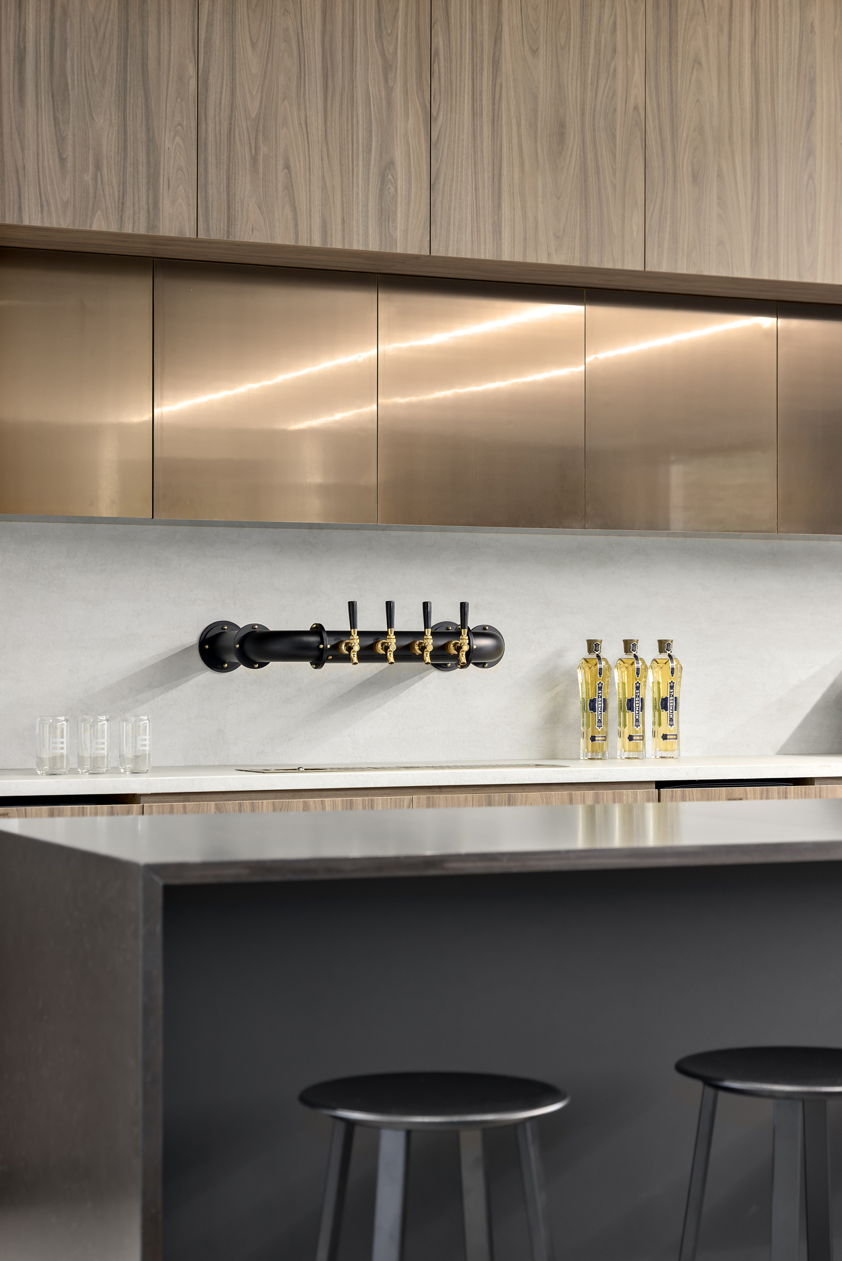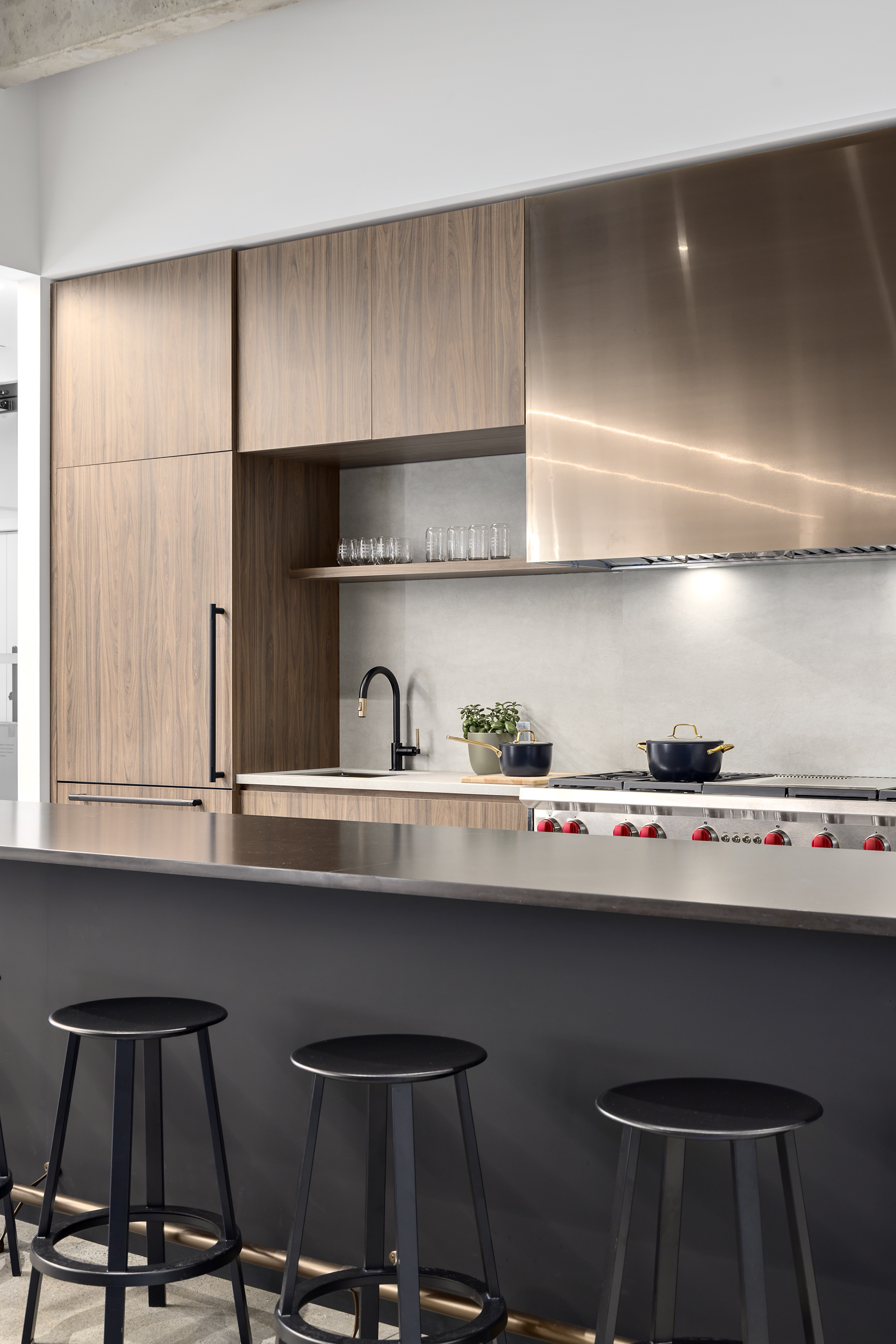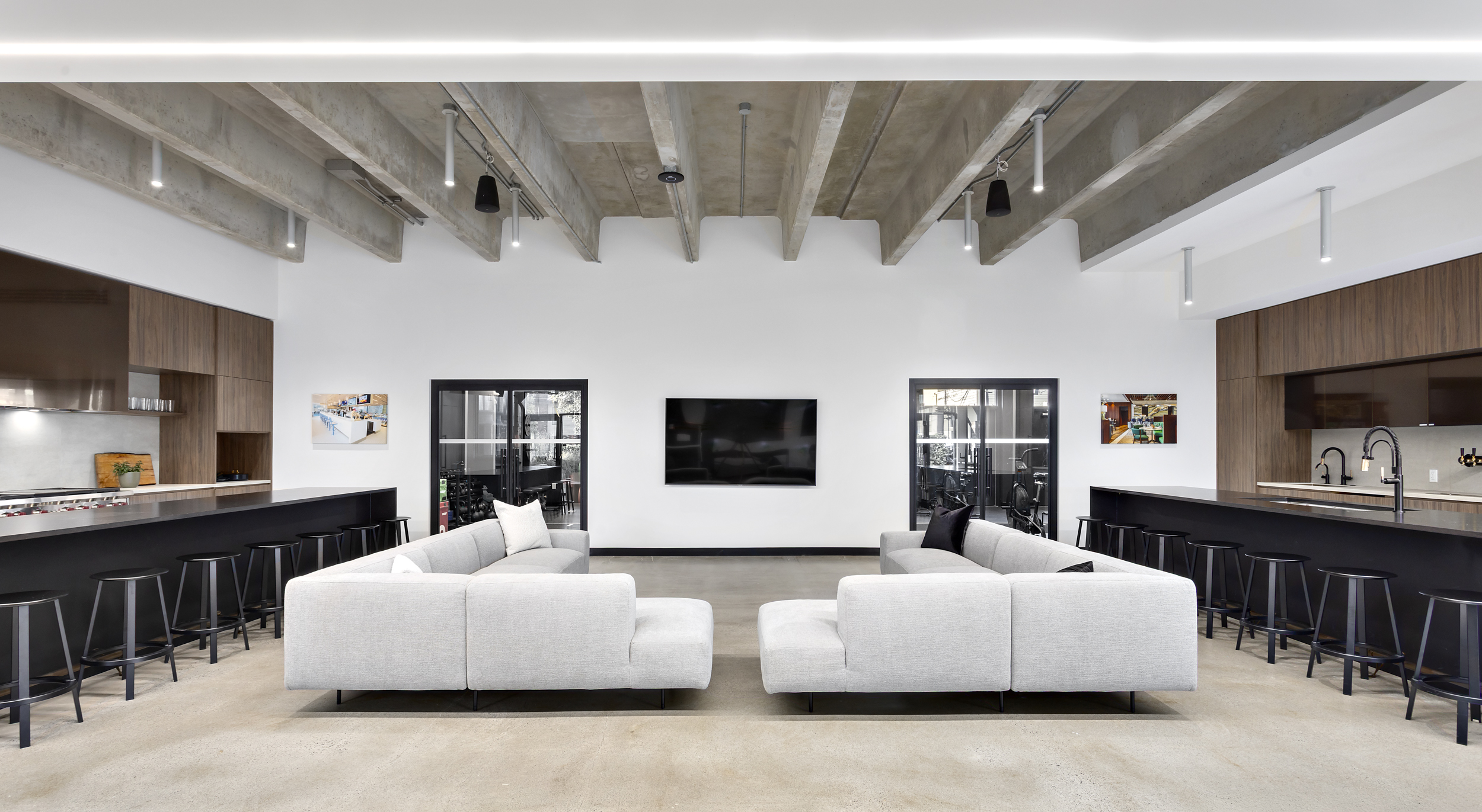 The alignment of vision and execution resulted in a highly successful transformation of the ETRO Construction headquarters, where MGBA reimagined an unpolished, underutilized space to reveal and celebrate the building’s inherent architectural character. Working closely with the highly collaborative and communicative ETRO team, the design emphasizes connection, quality, and authenticity—most notably through the introduction of a central staircase that links the two floors, creating a strong sense of arrival and visual continuity throughout the workplace. The main level is organized around collaboration and community, featuring a spacious kitchen and café-style gathering area, along with a dedicated wellness zone that supports employee well-being. Above, the second level provides a flexible mix of open desking, private offices, and breakout spaces to accommodate a variety of work styles. Inspired by the kindness, curiosity, and grounded nature of the ETRO team, the material palette blends raw, natural elements—exposed concrete, natural stone, and dark wood—with bright, intentional lighting and curated artistic accents. The result is a refined yet honest environment, layered with character and purpose, that reflects the craftsmanship, quality, and expertise that define the ETRO brand.
