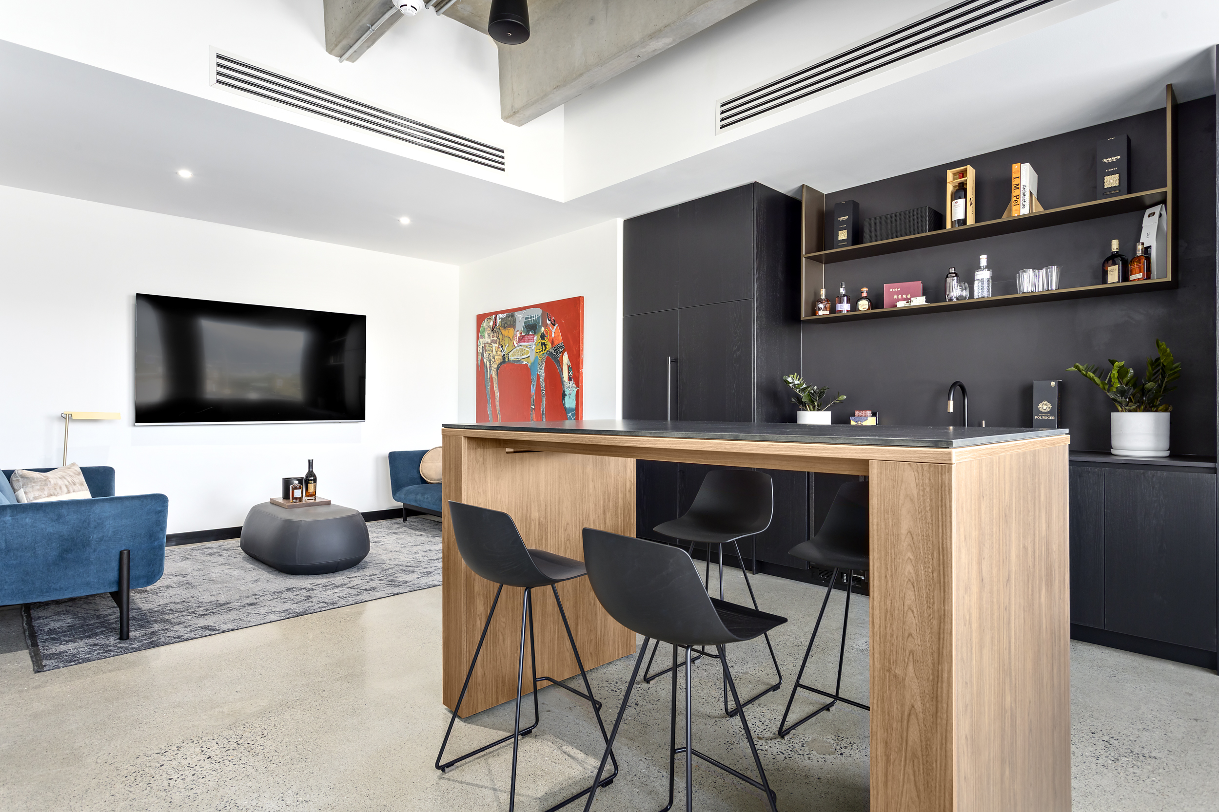 Inspired by the kindness, authenticity, and curiosity of the ETRO team, the design palette emphasizes raw, natural materials that integrate seamlessly with the existing building. Exposed concrete, natural stone surfaces, and dark wood tones create a grounded, honest aesthetic, balanced by bright, intentional lighting and curated artistic accents. The resulting environment feels direct and authentic—echoing the experience of working with the ETRO team themselves. Layered with character and purpose, the finished space reflects the craftsmanship, quality, and expertise that define the ETRO brand.