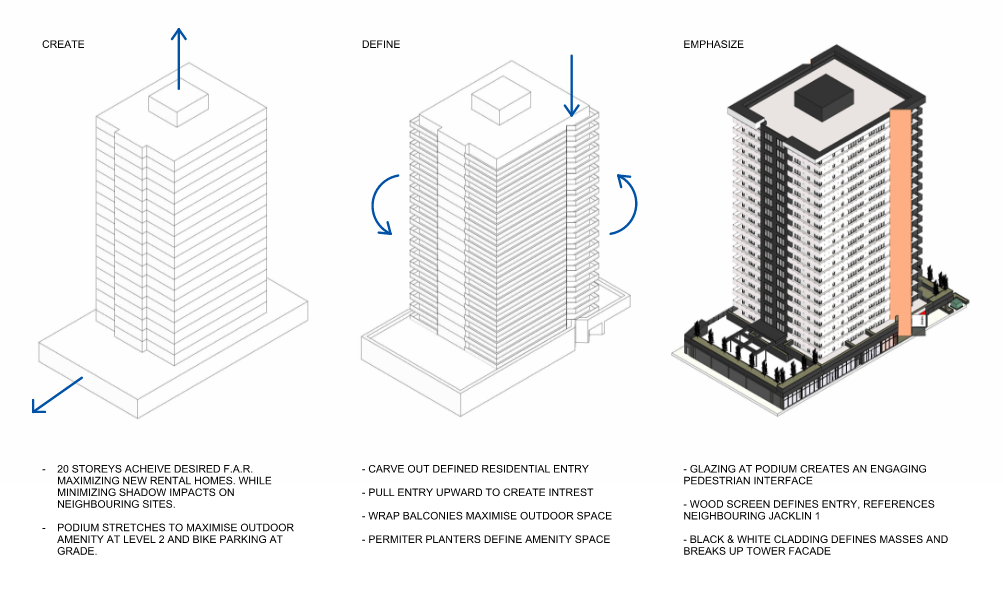 Providing a variety of suite types from studio to 2-bedroom units, Jacklin Tower is a 12-storey building with an amenity rich grounds and ample space for both vehicle and bike parking. Wrap around balconies optimize outdoor space for residents on the higher units, while larger patio areas are included on the lower floors that incorporate tree planters and small gardens.